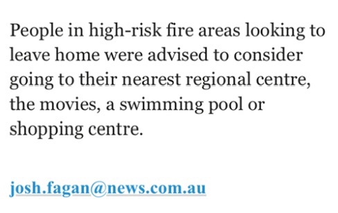 I have looked at the advice and I am not fleeing south. I will stay home. Partly because in the balance of things I think it will be best. However I think there may be confusion around town – especially given the advice (below) of going to the pictures. This warning is supposed to be about bushfires, not heatwave. Plus, we are a regional centre advised to leave.