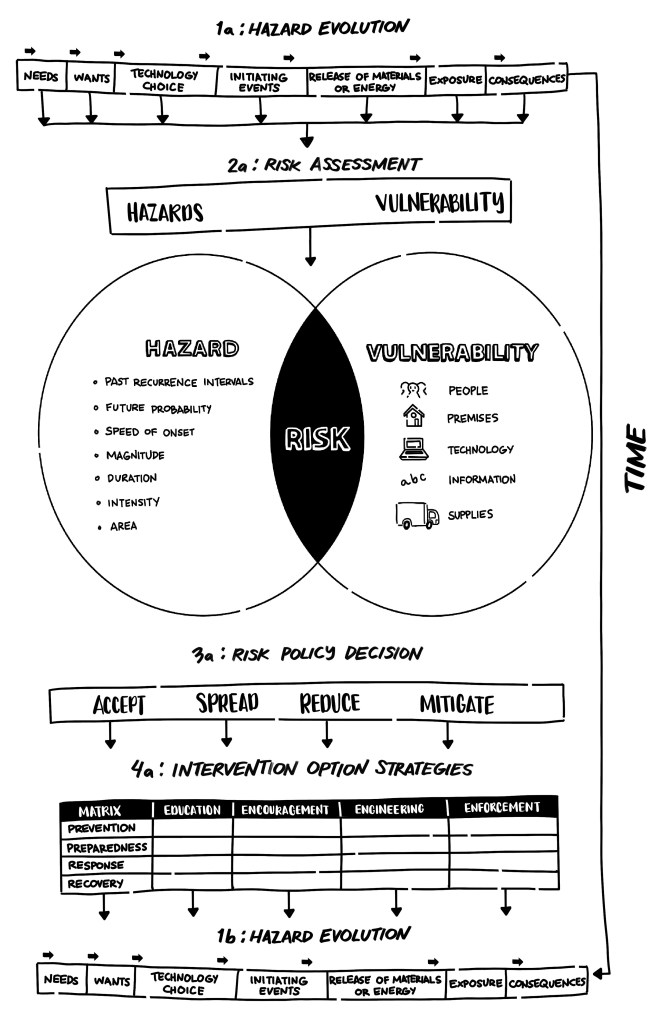 I have cut and pasted together a comprehensive framework or model (using a business continuity context) which integrates a range of heuristics. These include the causal approach; conceptualising risk as a function of hazard and vulnerability interfaces; a standard policy framework; and a matrix cross stimulating Hadden’s four Es and FEMA’s Psquared Rsquared. Hopefully it can support the use of risk perpectives to identify future improvements and opportunities