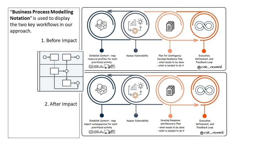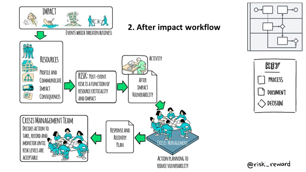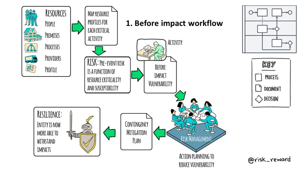 Our approach focuses on before and after “action planning” opportunities. Opportunities to act identified by asking the right questions, collecting the right information and applying agreed criteria to decisions both before impact to prevent and after impact to mitigate. Before impact, these criteria focus on what is critical, and how susceptible the critical things are in the circumstances and under the conditions we are considering. After impact, these criteria focus on what is critical, and how badly those critical things have been impacted. Two workflows – each with three key steps enhanced by feedback and refinement, and displayed in logical workflows.
