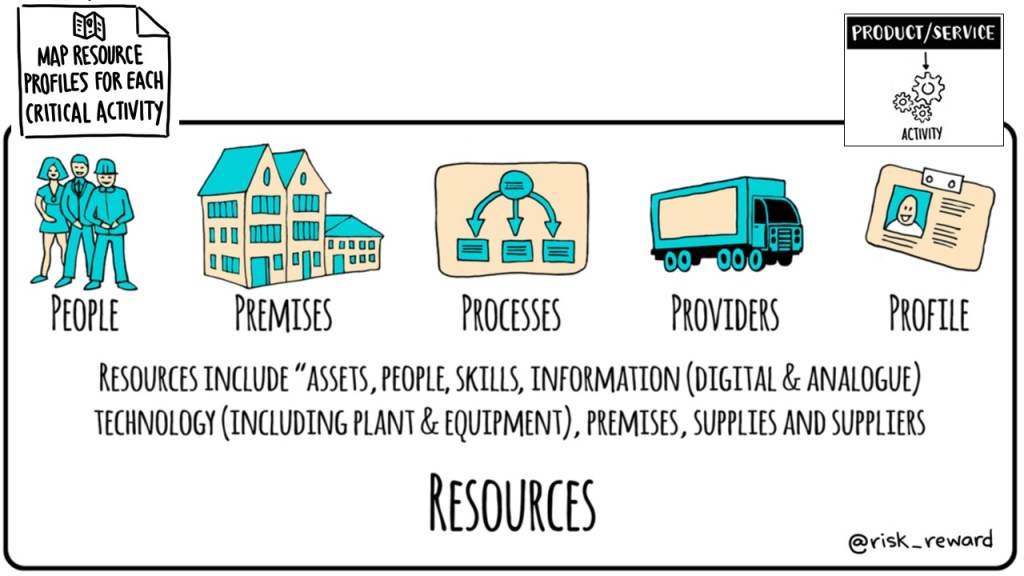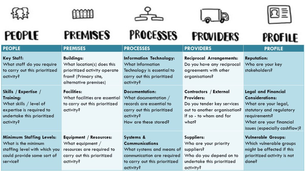 Establishing context before impact relies on mapping the resource profiles for each critical activity. Resources are defined in various standards. To support a comprehensive and balanced approach we use a heuristic device called “The Five Ps”. People … Premises … Processes … Providers … and last, but not least, Profile. Developed initially in England’s local government sector early this century, it has become a tried and trusted approach globally, for both stimulating conversations and for collecting data.