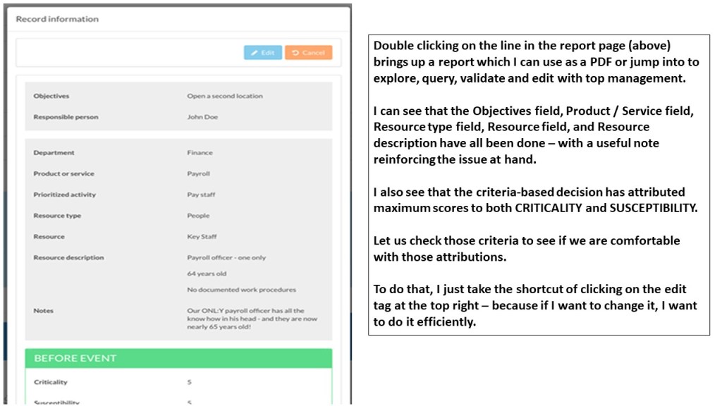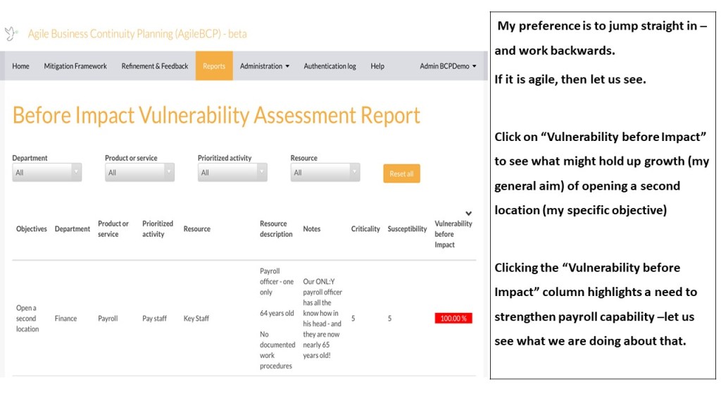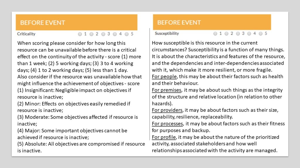 Second – your baseline data is – or ought to be – up to date. Therefore all you need to do is assess after impact vulnerability by attributing an impact score to the resources underpinning prioritized activities.