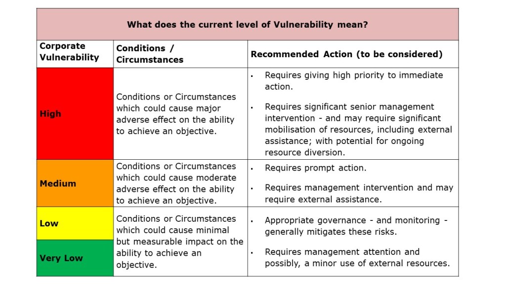 “Traffic lights” are used to draw attention to what the current level of vulnerability might mean.