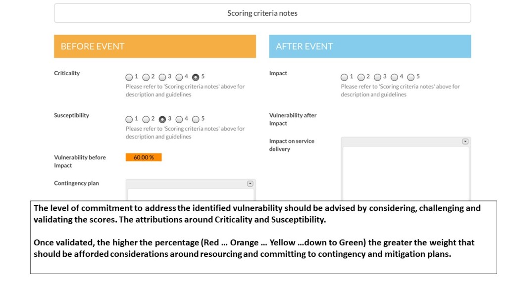 The information is used to attribute an appropriate “score” according to agreed criteria around (a) criticality and (b) susceptibility. The Before Impact Vulnerability of the entity is a function of these two attributes – Criticality and Susceptibility.