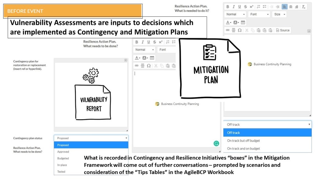 What is recorded in Contingency and Resilience Initiatives “boxes” in the Mitigation Framework will come out of further conversations – prompted by scenarios and consideration of the “Tips Tables” in the AgileBCP Workbook.