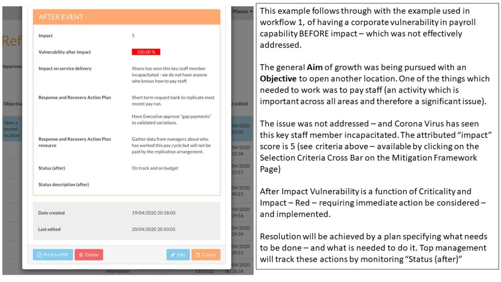 When an event does impact the organization you have two advantages. First you are resilient due to your Before impact workflow which addressed contingencies and mitigated vulnerabilities.