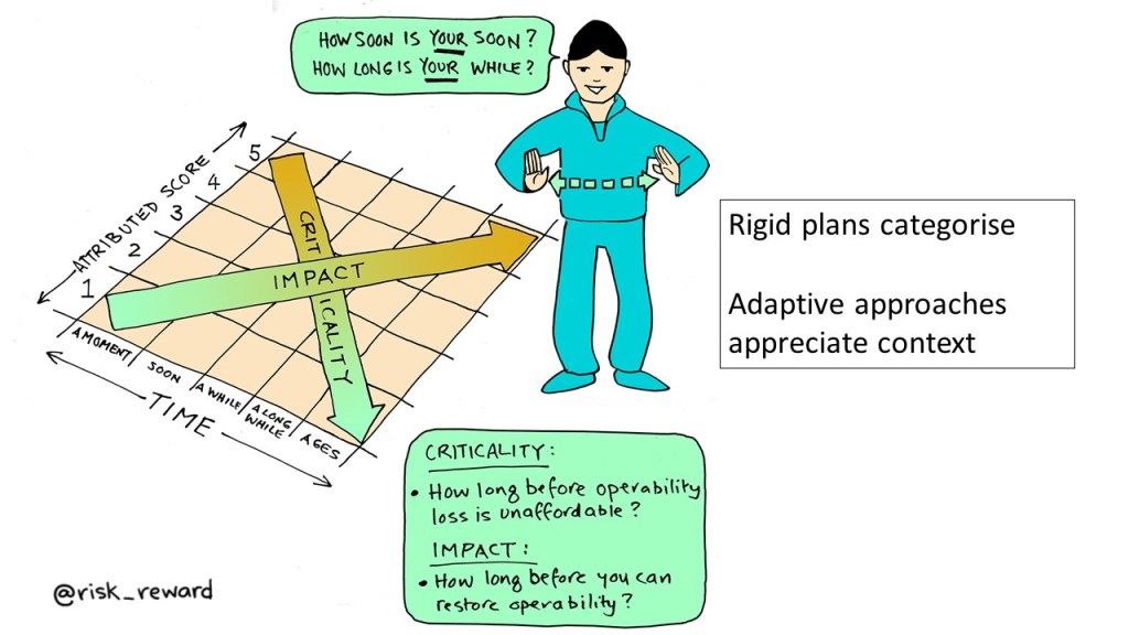 Time sensitivity of our products and services will vary – context is crucial to considerations around “how soon is your soon?” – “how long is your while?” Rigid plans categorise – adaptive approaches appreciate context. Again, a key Corona reminder has been the need to appreciate context and be agile.