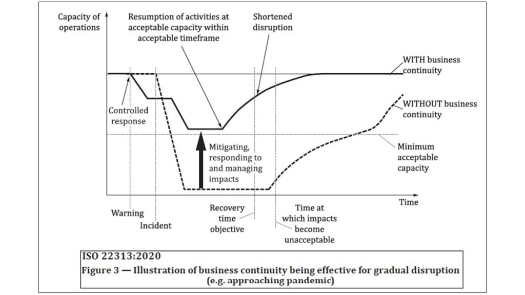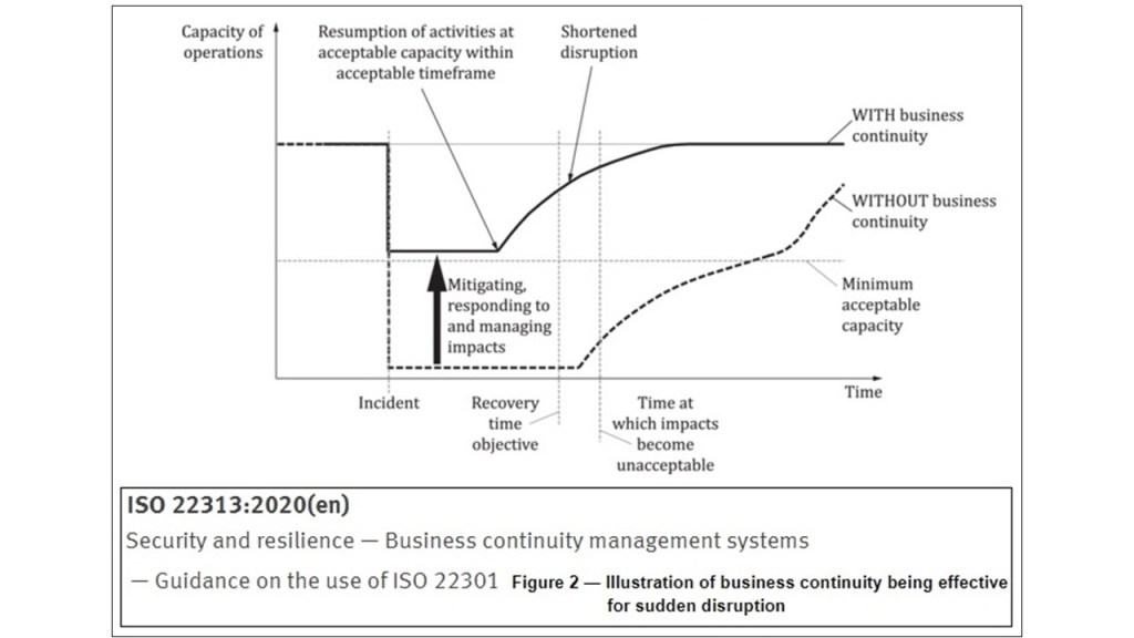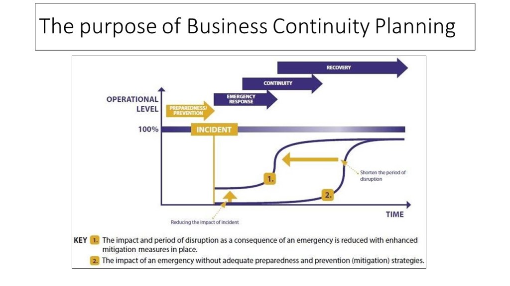 The aim – or purpose – of Business Continuity Planning is to build our capabilities to mitigate impact. The aim is to pull the impact curve “back” so that we are affected for less time than otherwise; and to pull the curve up so that we reduce the level of impact.