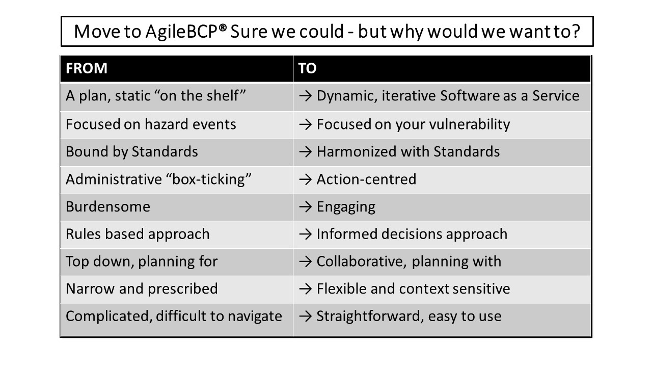 In 1998 while promoting the Australian approach to emergency risk management I used the above quote from Mazzini. It was an opportunity to reset our approach – to move from a focus on hazards to a focus on vulnerability. Similarly, today I share an exciting step we had on 1 June as our AgileBCP software development project transitioned from testing and has soft launched to potential consulting partners.