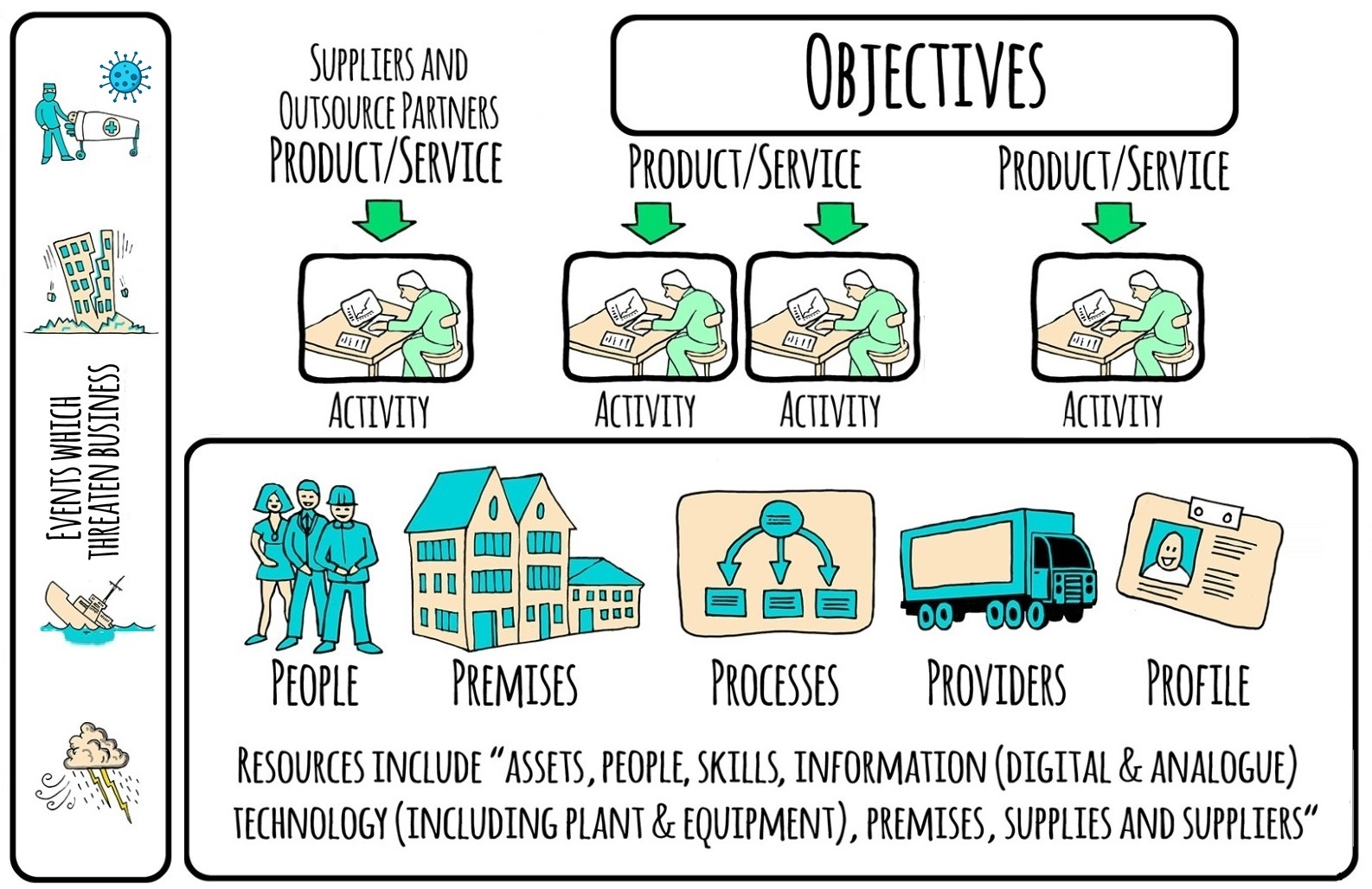 These products and services are made possible by the critical activities which produce them – and significantly, for business continuity, the resources which underpin those activities.