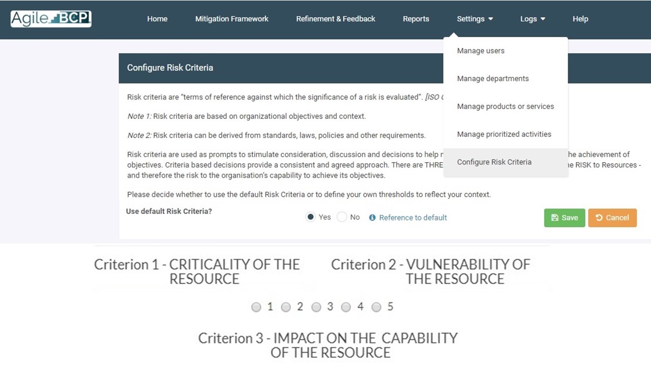The risk criteria used in the AgileBCP® approach are about the importance of elements at risk (criticality); vulnerability; and impact.