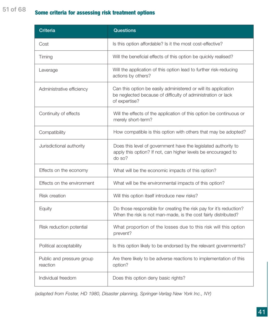 Reference – Emergency Risk Managament Guide (Emergency Management Australia, 2004 (p41 of the hard copy, or p51 of the soft copy)