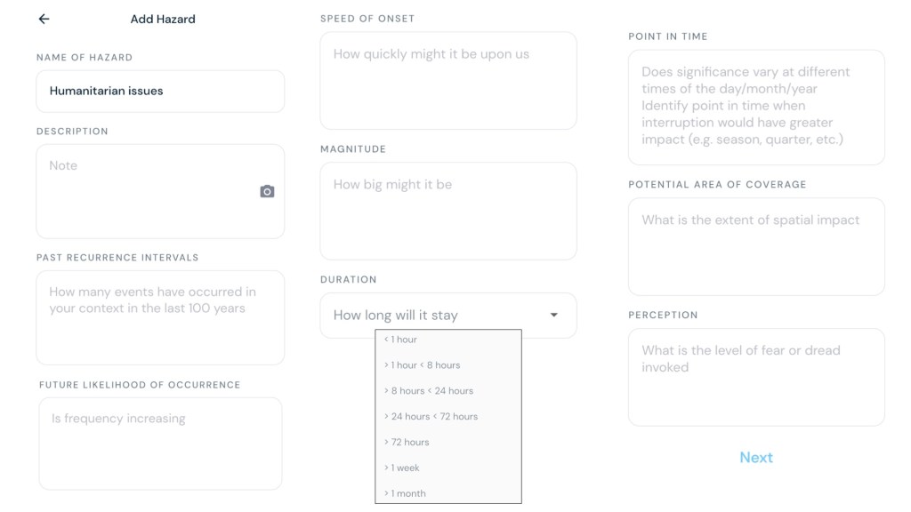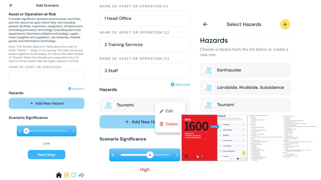 For each asset, list hazards that could cause an impact. Use the list of Hazards from NFPA 1600 while still allowing other hazards to be added.