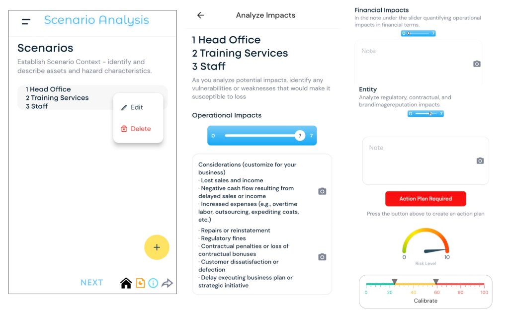 The risk dial combines the rating for “scenario significance” and the highest rating from “analyze impacts”. Any HIGH risk will trigger the need for an action plan.