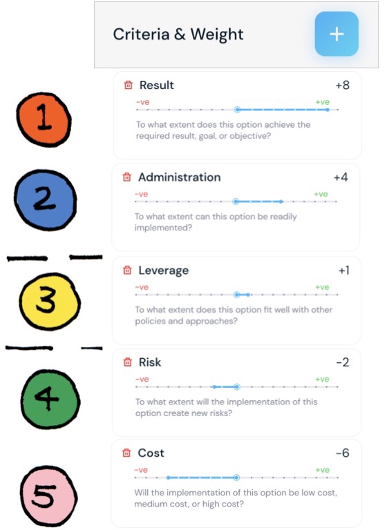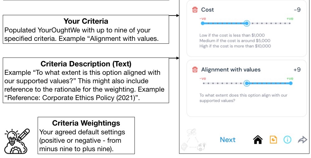 (ii) Criteria Description (Text) – example “To what extent is this option aligned with our supported values?”.