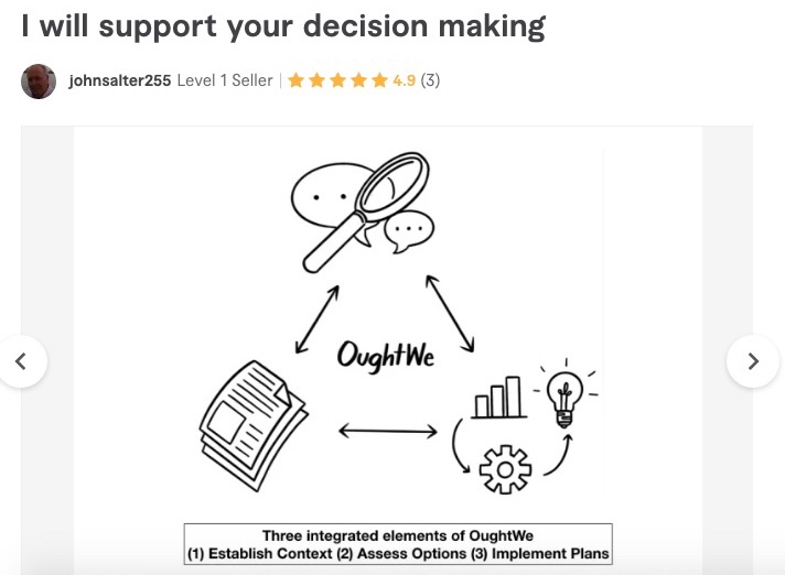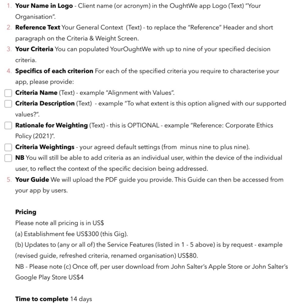 NB Development of the above specifications is best done with others. Especially those who need to develop and sign off on “what they value – and how much they care about those things they value”.