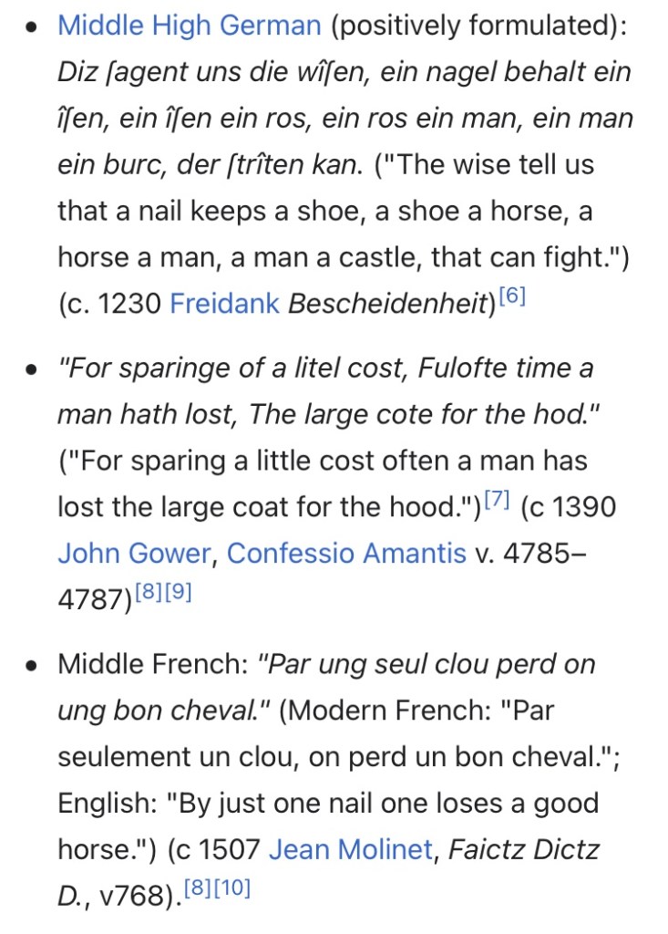“For want of a nail” is a proverb, having numerous variations over several centuries, reminding that seemingly unimportant acts or omissions can have grave and unforeseen consequences.