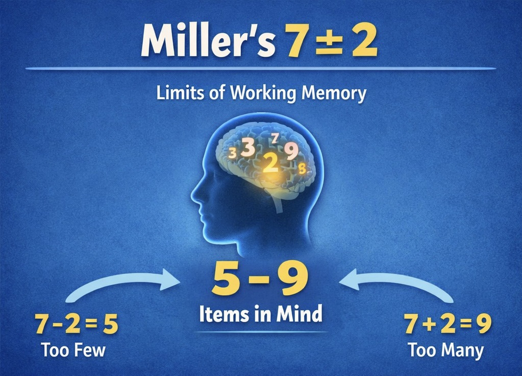 · What it is: George A. Miller’s famous paper identified a cognitive bottleneck in working memory. Humans can hold only about 7 (±2) discrete chunks of information in their conscious attention at one time.