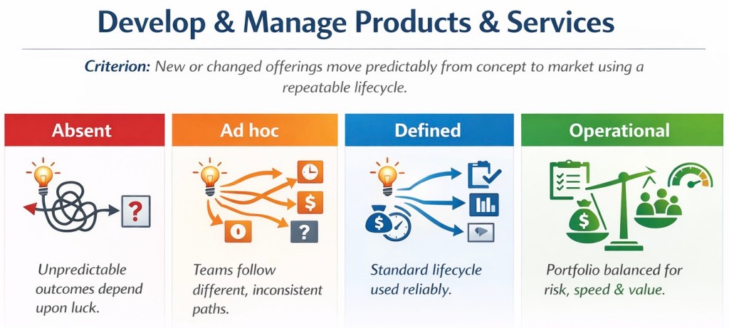 Criterion: New or changed offerings move predictably from concept to market using a repeatable lifecycle.