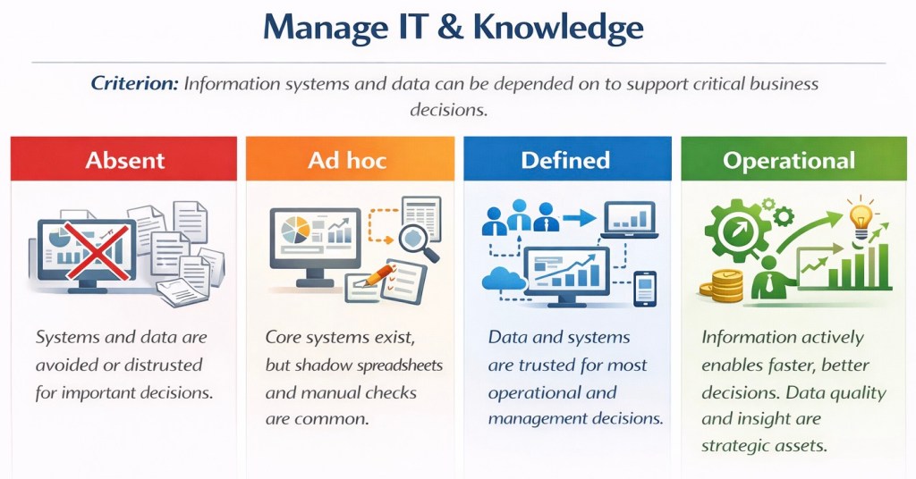 Information actively enables faster, better decisions. Data quality and insight are strategic assets.
