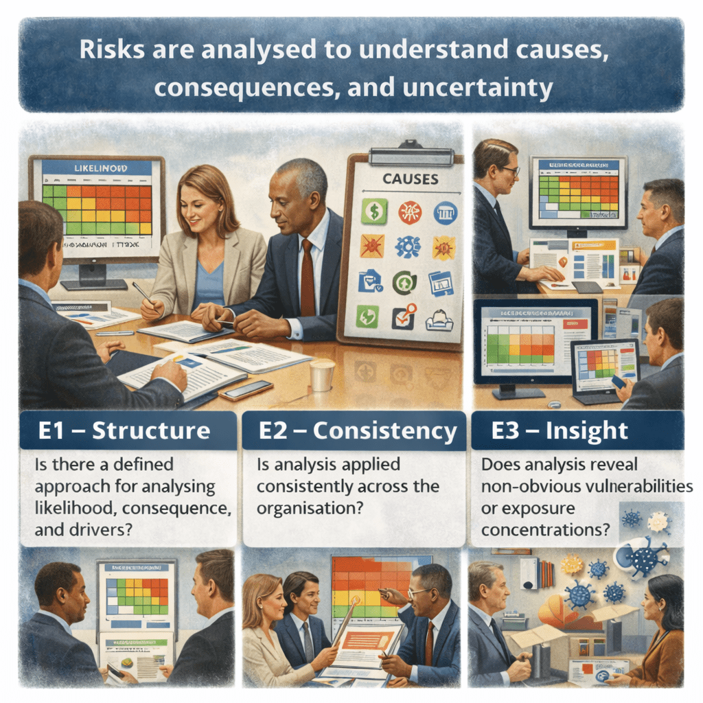Risks are analysed to understand causes, consequences, and uncertainty.