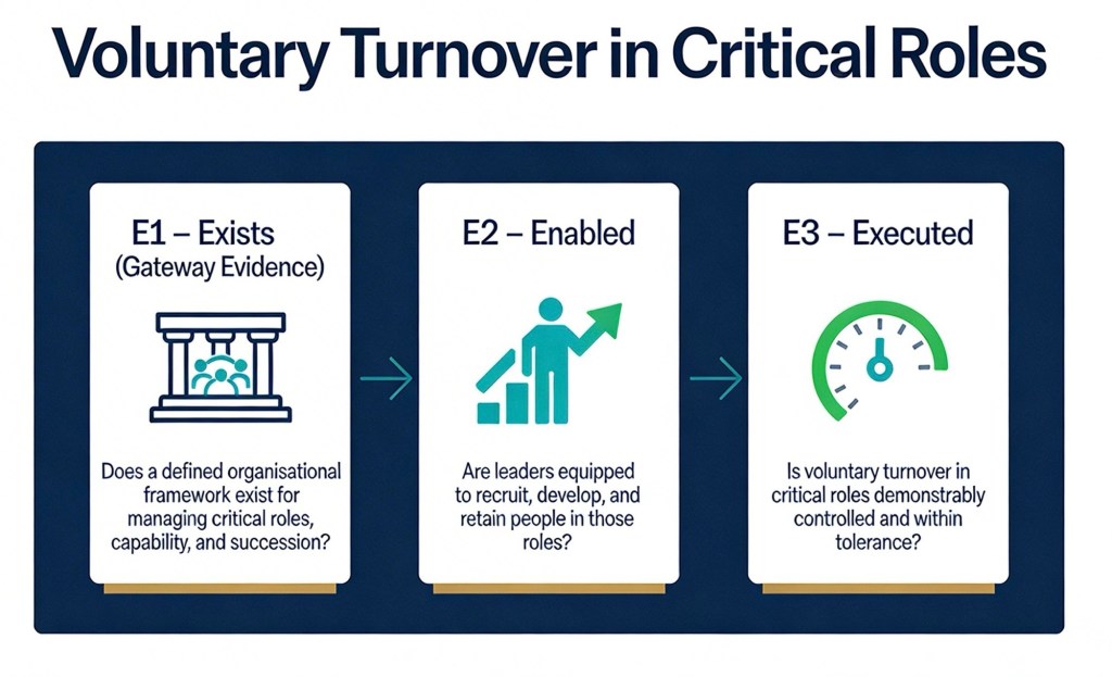 You can think of the assessment as asking: “Can we show there is a clear framework, that leaders are equipped to use it, and that the turnover outcome is actually under control?” Below are examples of evidence and notes that would typically support each level.