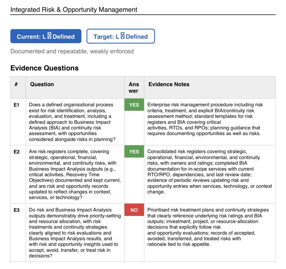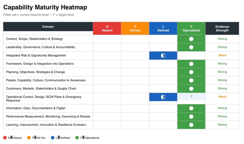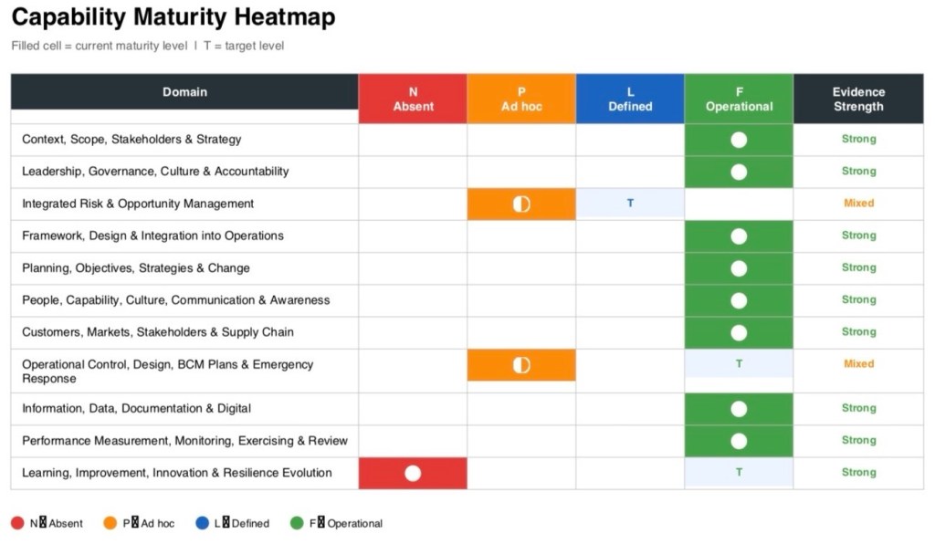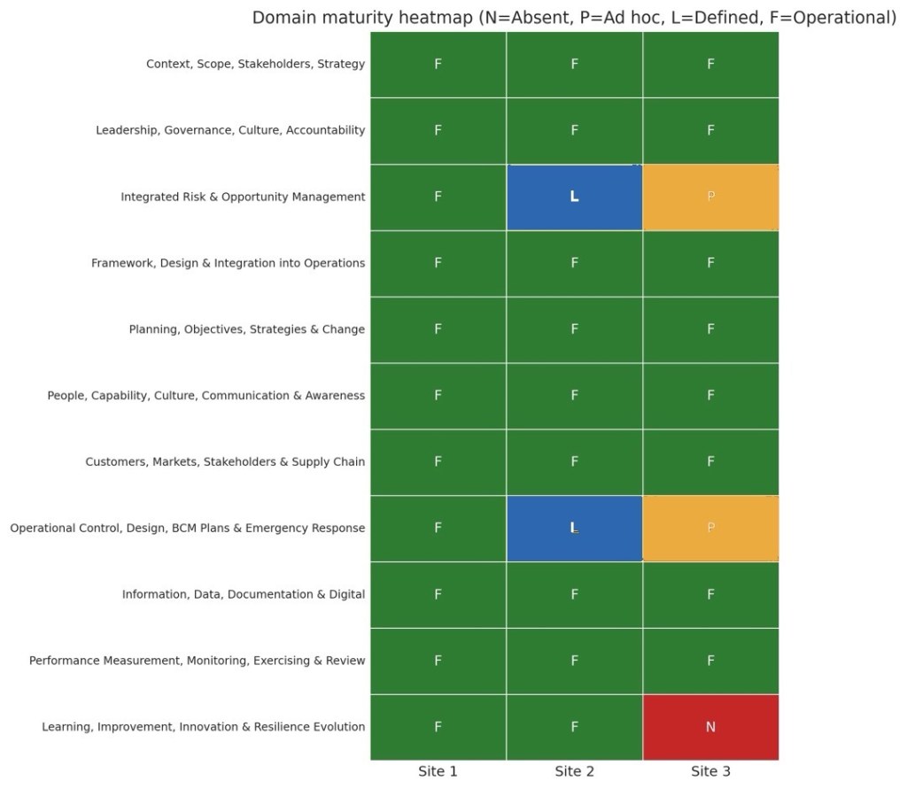 This particular assessment covered three sites against all 11 management capability domains, with results showing a solid common framework but uneven maturity in a small number of operational resilience areas.