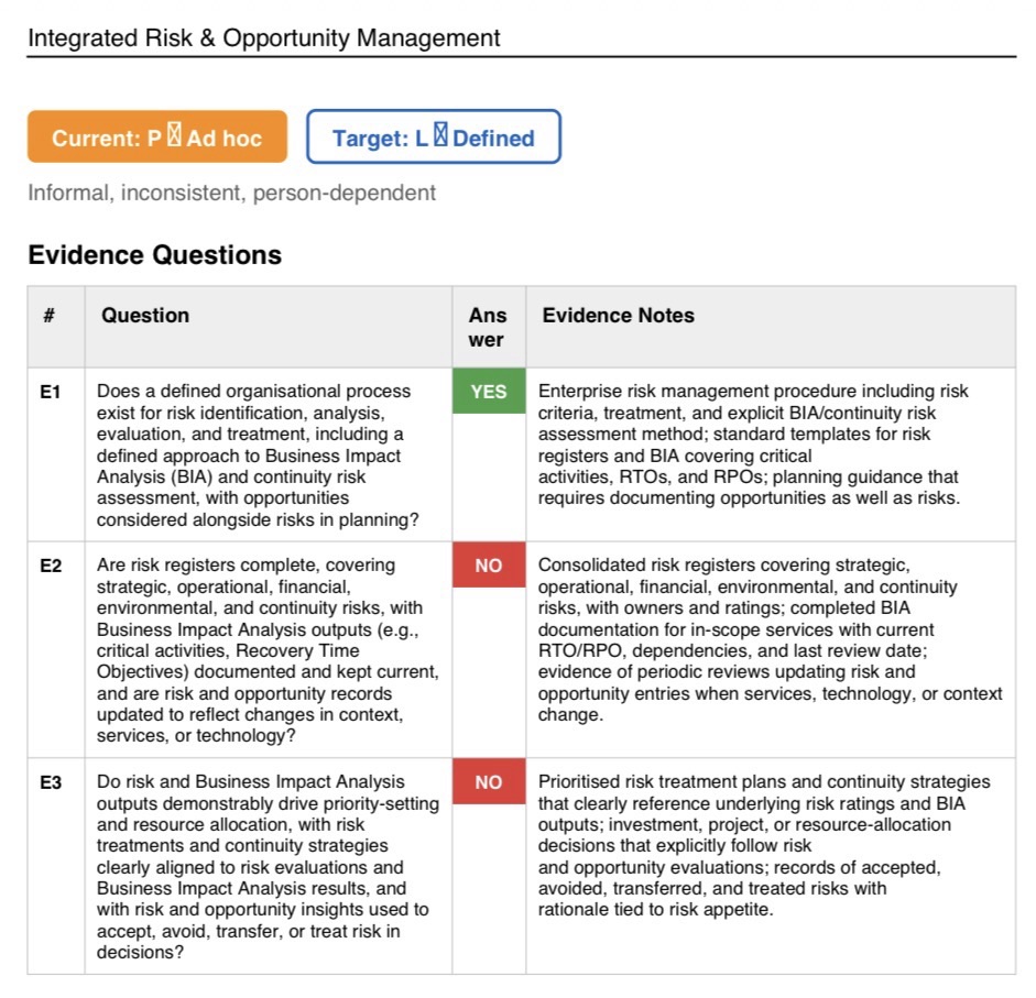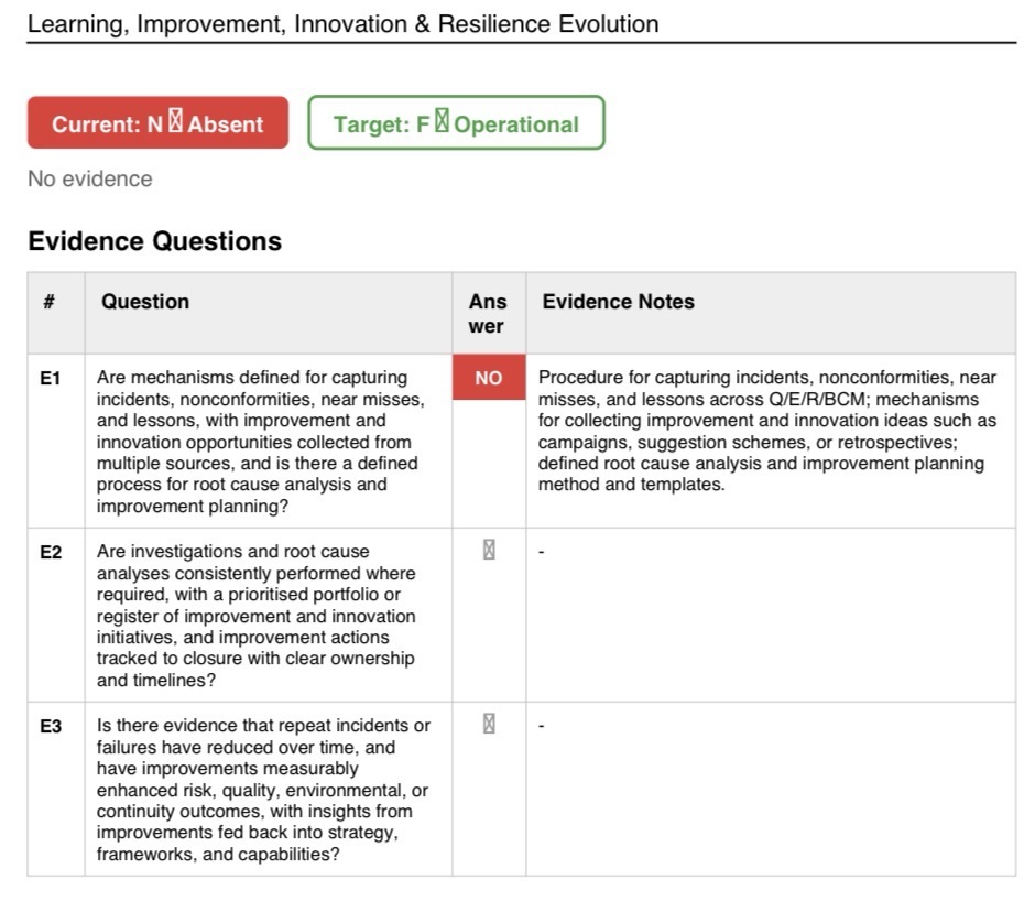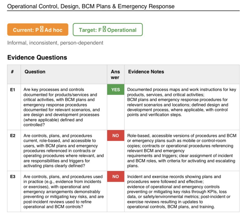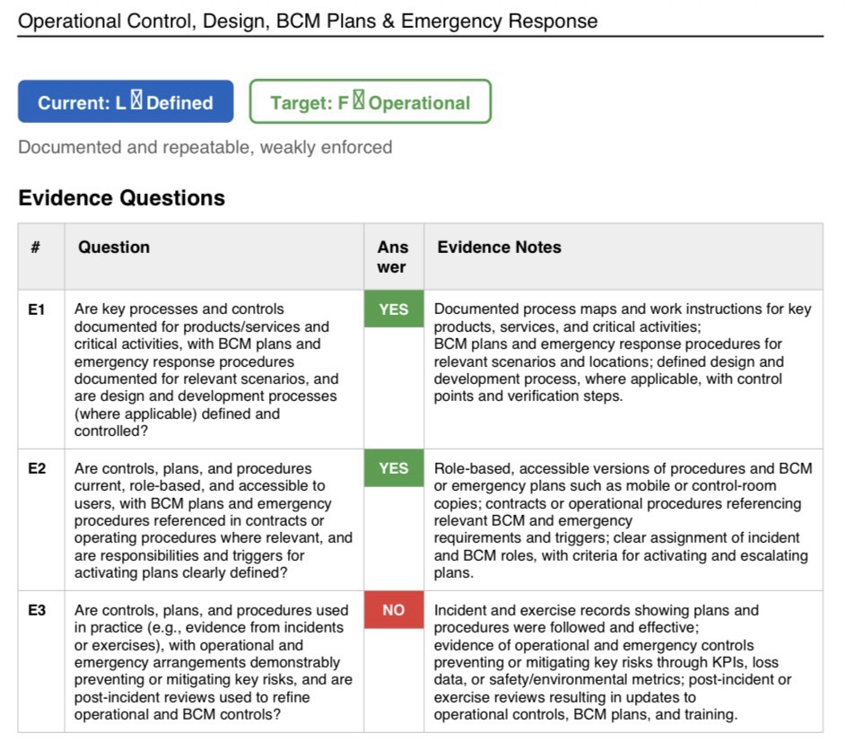The main maturity gap is concentrated in three areas: Integrated Risk & Opportunity Management, Operational Control/BCM Plans/Emergency Response, and Learning/Improvement/Innovation/Resilience Evolution.[1][2][3]