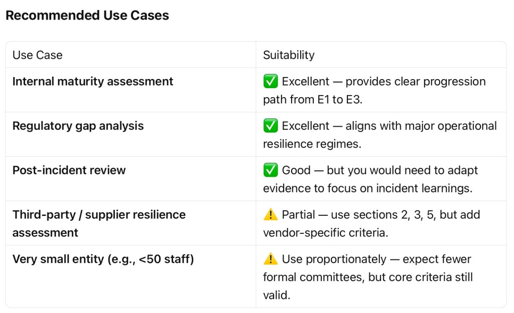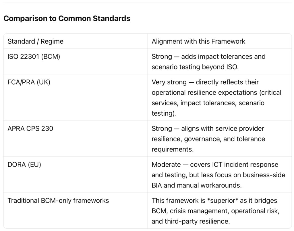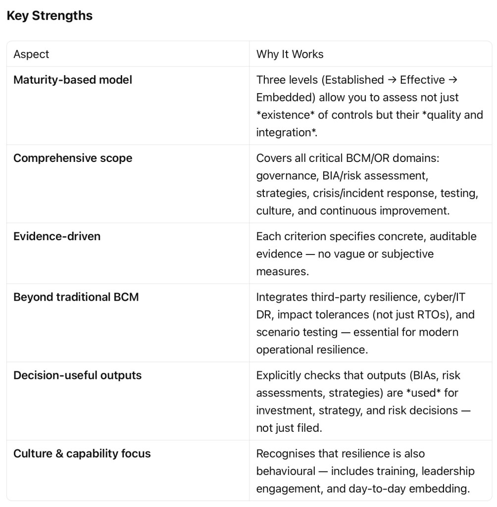Summary This framework is well-designed for reviewing and assessing an entity’s Business Continuity Management (BCM) and Operational Resilience (OR) capability. It is professional-grade, aligned with regulatory expectations (e.g., UK FCA/PRA, APRA CPS 230, DORA), and suitable for internal audits, gap assessments, or external reviews.