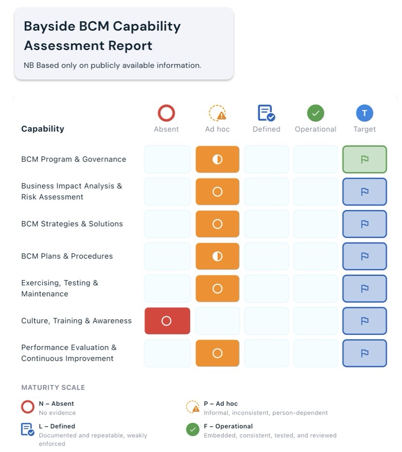 Bayside Council is a good public example of a continuity programme with visible policy and governance foundations, but the public evidence set is insufficient to demonstrate a fully defined or operational capability under the report’s necessary-and-sufficient E1/E2/E3 standard.[3][2][1]