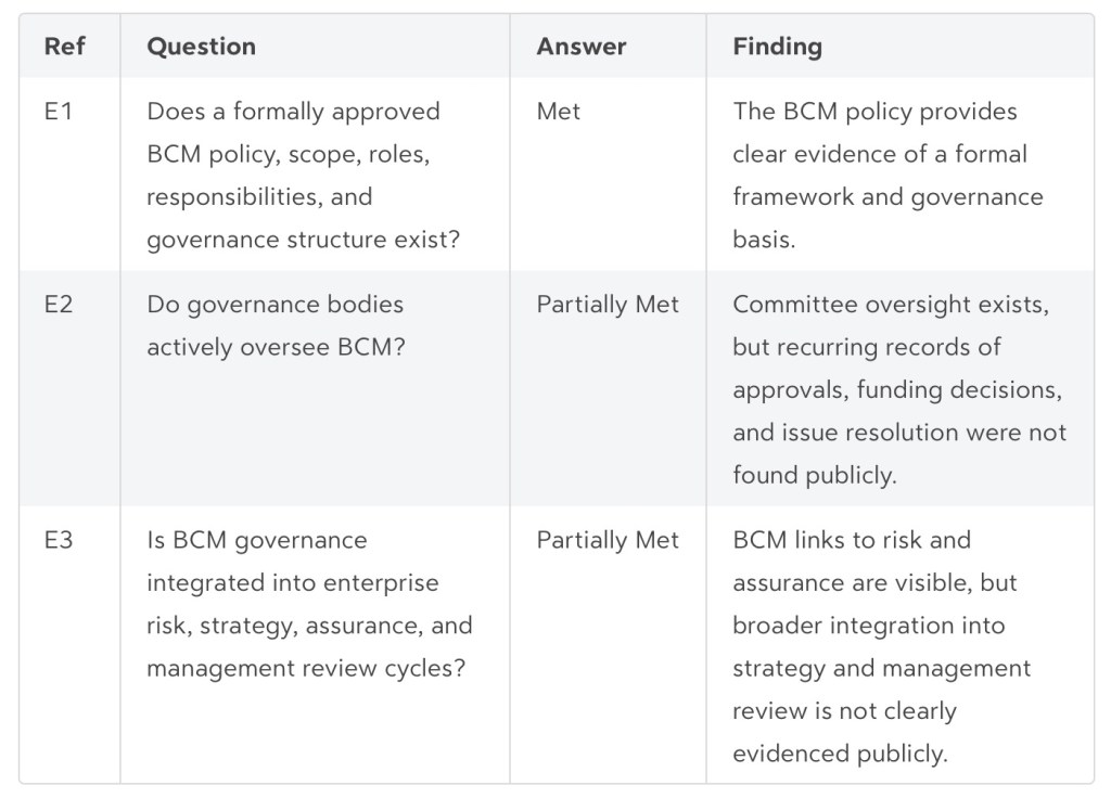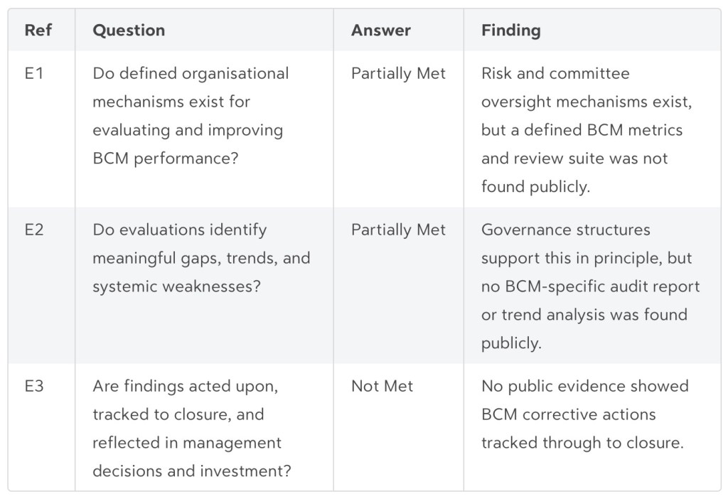 Assessment note: Wider governance and assurance mechanisms exist, but BCM-specific evaluation evidence is limited.