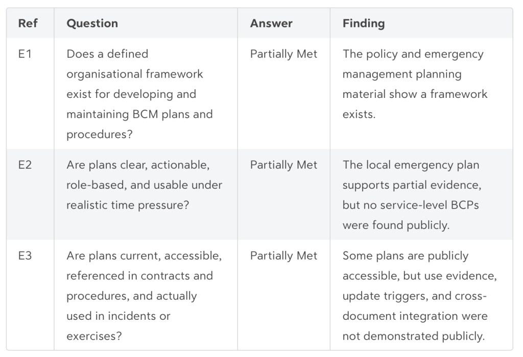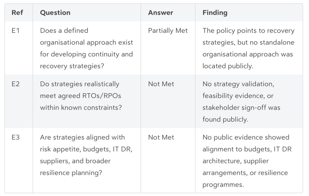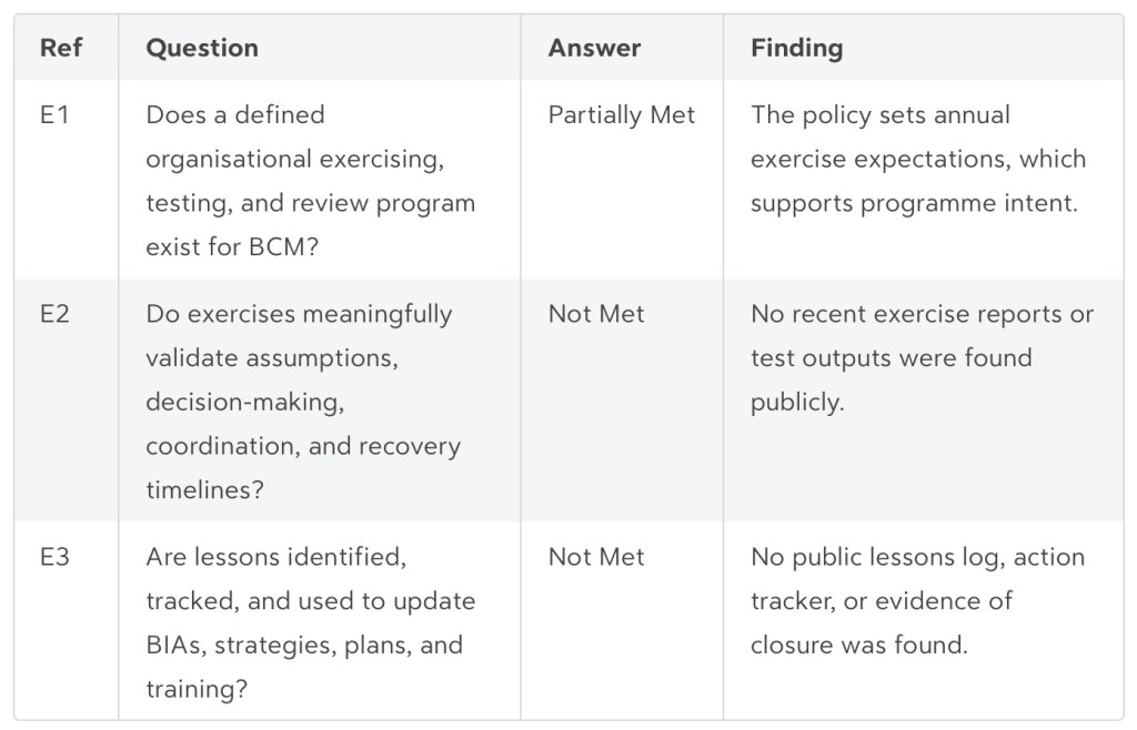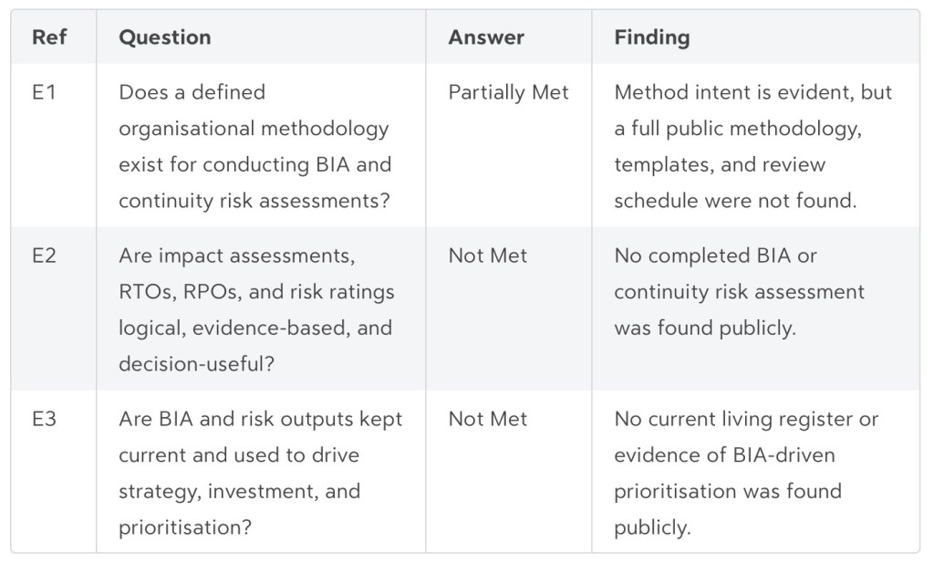 This means the organisation appears to have continuity architecture in place, but there is not enough publicly available evidence to demonstrate that the programme is routinely exercised, maintained, measured, and improved in line with the E2 and E3 evidence standard.