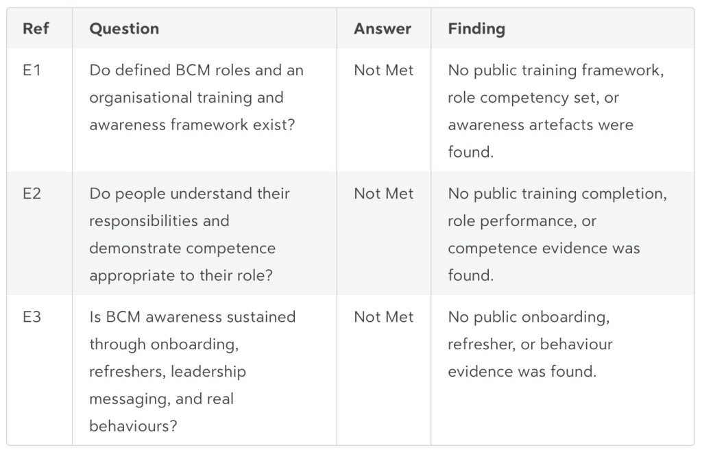 Assessment note: No public evidence was found to show a BCM training and awareness capability.