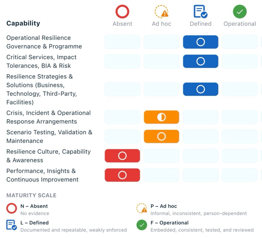- Position the assessment as evidence that the organisation has a defined framework but is in the early stages of embedding resilience into operations (overall maturity 28.6%, no domains yet at “Operational Strength”).