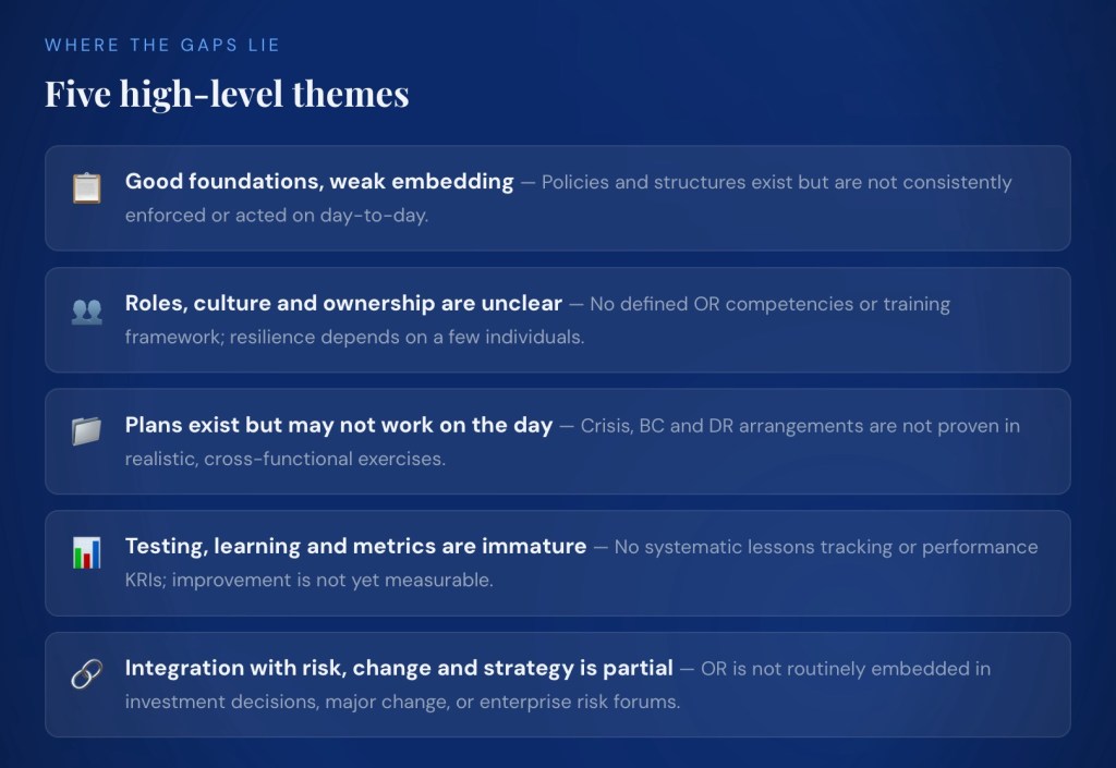 - Governance: policy and committee structures exist, but OR is not yet fully integrated into enterprise risk, strategy, change, and assurance processes. This makes accountability blurry at executive level (who “owns” resilience outcomes versus activities).