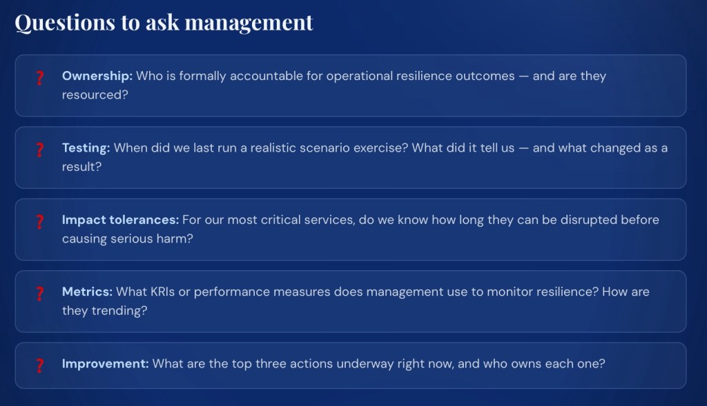 - Stand up a single source of truth for critical services, impact tolerances, BIAs and key risks, with defined review triggers (annual plus event‑based).