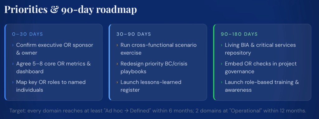 - Define a small, meaningful set of OR metrics/KRIs (e.g. critical service coverage, currency of BIAs and plans, test pass rates, incidents vs impact tolerances).