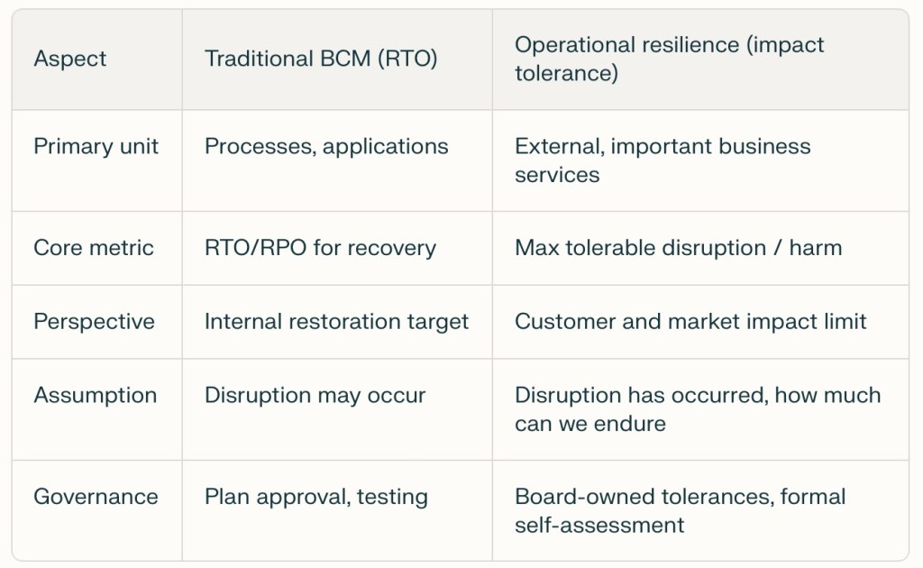 - For regulated clients, the centre of gravity has clearly moved to impact‑tolerance‑led, service‑centric resilience, with BCM and RTOs nested inside.[2][3][4][7][1]