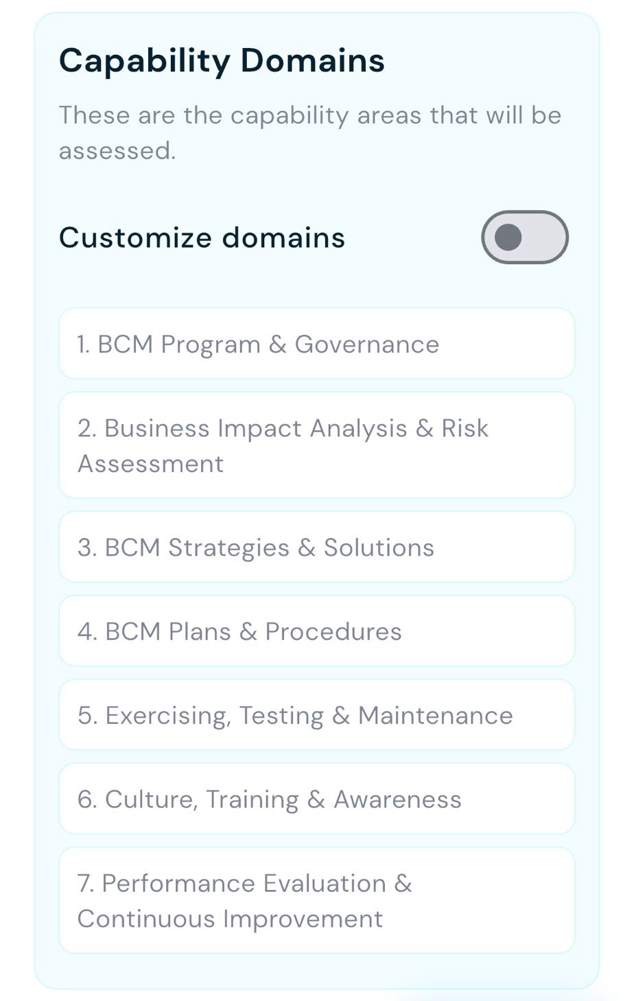 We offer capability assessments across seven key areas.