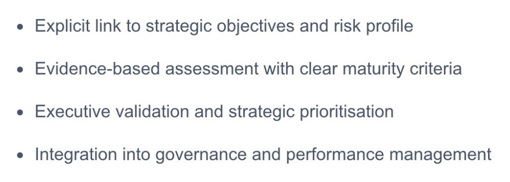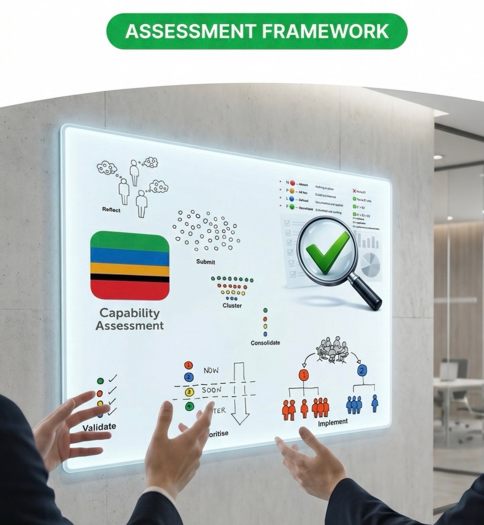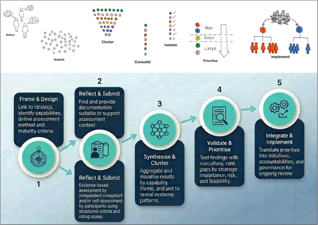 “Validation and Prioritisation” is explicitly framed as a strategic decision step. Findings are tested with executives and key stakeholders; priorities are set based on strategic importance, risk exposure, interdependencies between capabilities, and feasibility of improvement – not just perceived weakness.